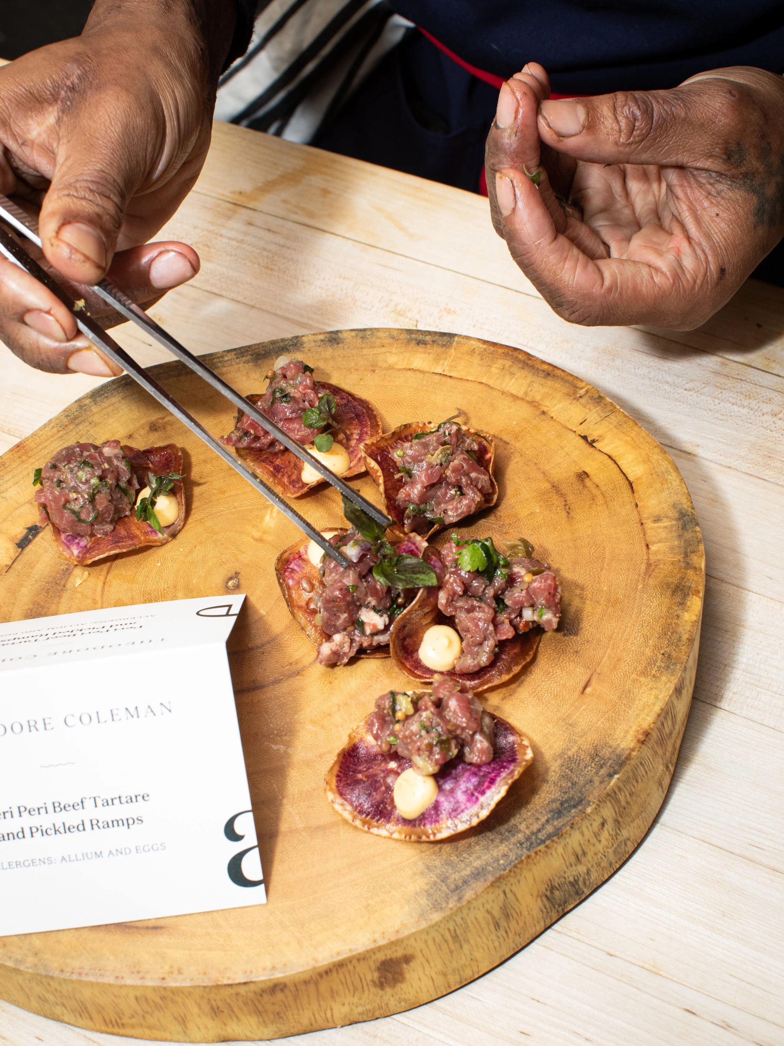A protégé of Floyd Cardoz and Alex Stupak, Theo sharpened his skills at North End Grill, Paowalla, Empellón, and Mischa. In 2021, he joined the inaugural class of James Beard Fellows and became a fierce advocate for food education through his work with the Food Education Fund. Whether plating at the Beard House, teaching, or competing on the culinary battlefield, he cooks like a memory igniting itself—layering smoke, citrus, crunch, and history into every bite.